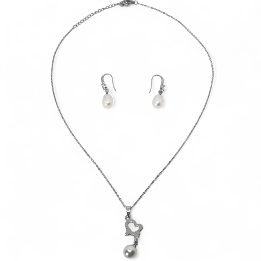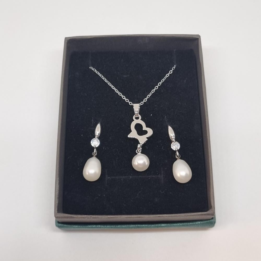 تألقي بإطلالة ناعمة ولامعة مع هذا الطقم الفضي من اللؤلؤ الطبيعي الزراعي.